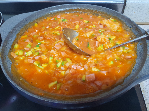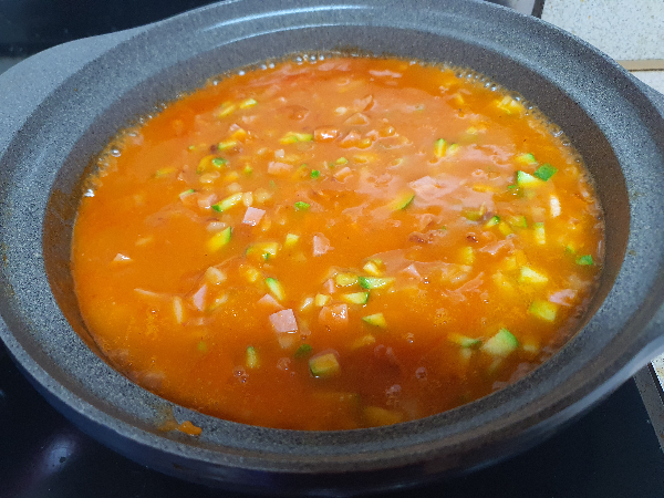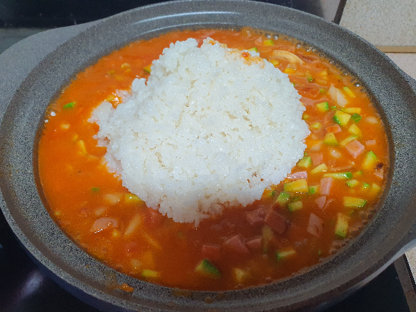 소스가 보글보글 끊으면, 찬밥을 넣어준다. 나는 냉장고에 있던 밥을 해동하여 한 덩이를 냄비에 넣어주었다.