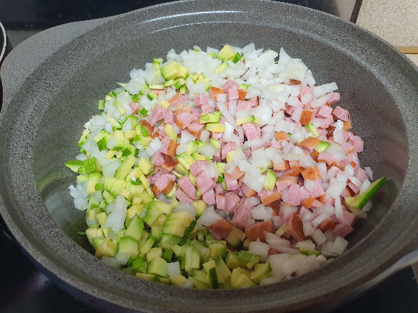 재료만 썰어주면 거의 끝난다. 정말 간단하다. 이제 이 다이스 한 재료들을 기름을 살짝 두른 냄비에 넣고 볶아준다.