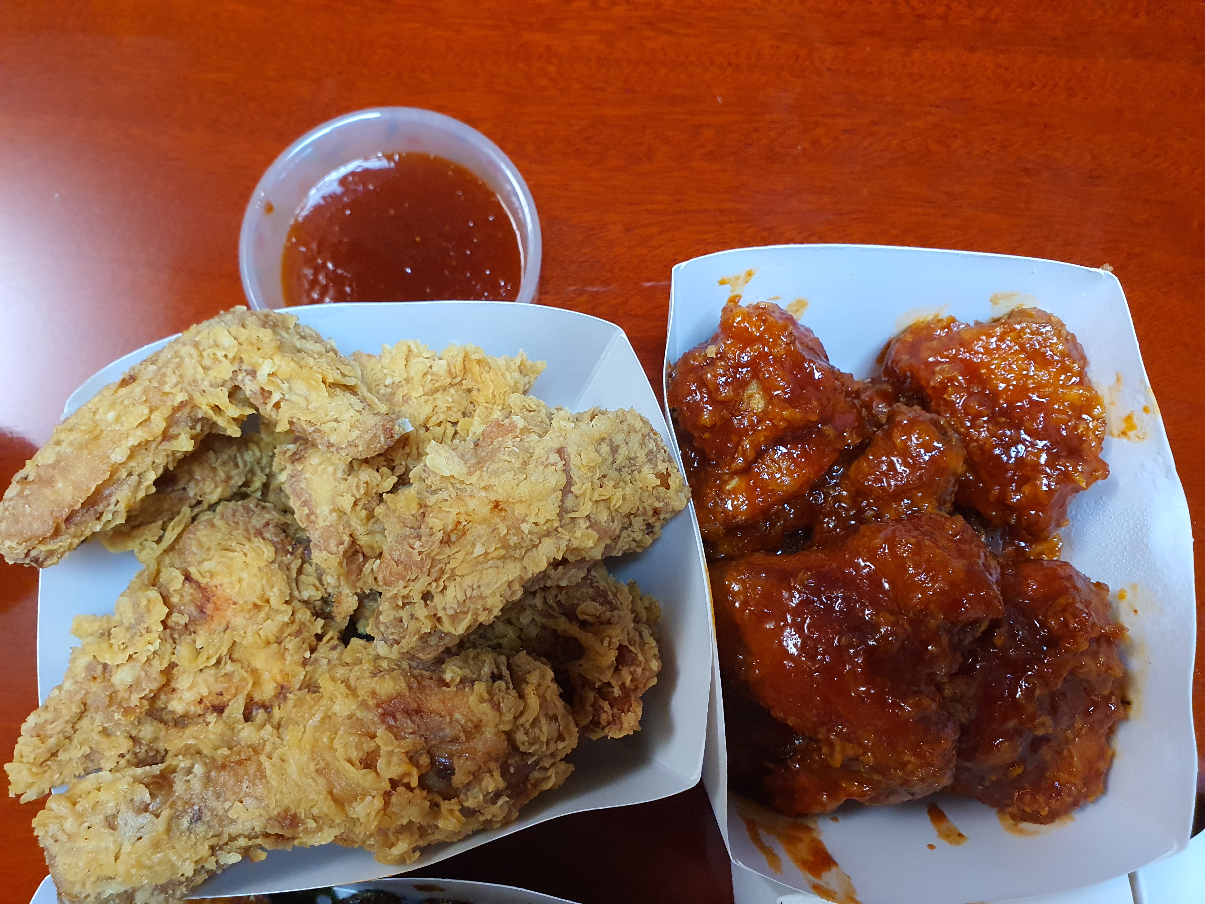 우선 반반 치킨은 사진으로 보는 바와 같이 후라이드와 양념이 반반 들어 있는데, 난 개인적으로 후라이드가 가장 맛있었다. 익숙한 맛이라고 해야 하나 아님, 나이가 들어서 자극적인게 싫어서 그런건지는 모르겠다. 담백하고 치킨 특유의 감칠맛이 좋았는데 계속 먹으면, 끝맛이 질릴 수도 있겠다는 생각이 들었다. 나랑 동갑인 울 남편도 후라이드가 가장 맛있다고 했다.